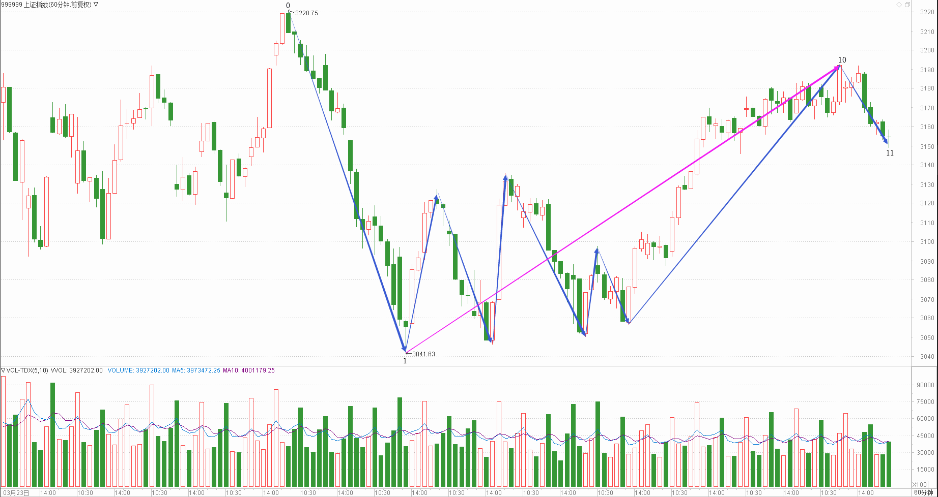 : 月线调整周线调整日线中继时线调整分线趋势(30+25+20+30+25)/5=26