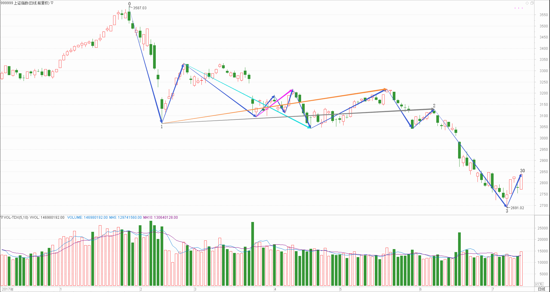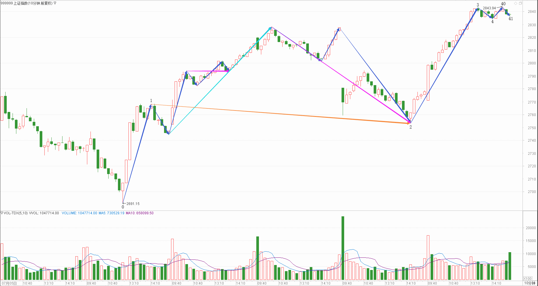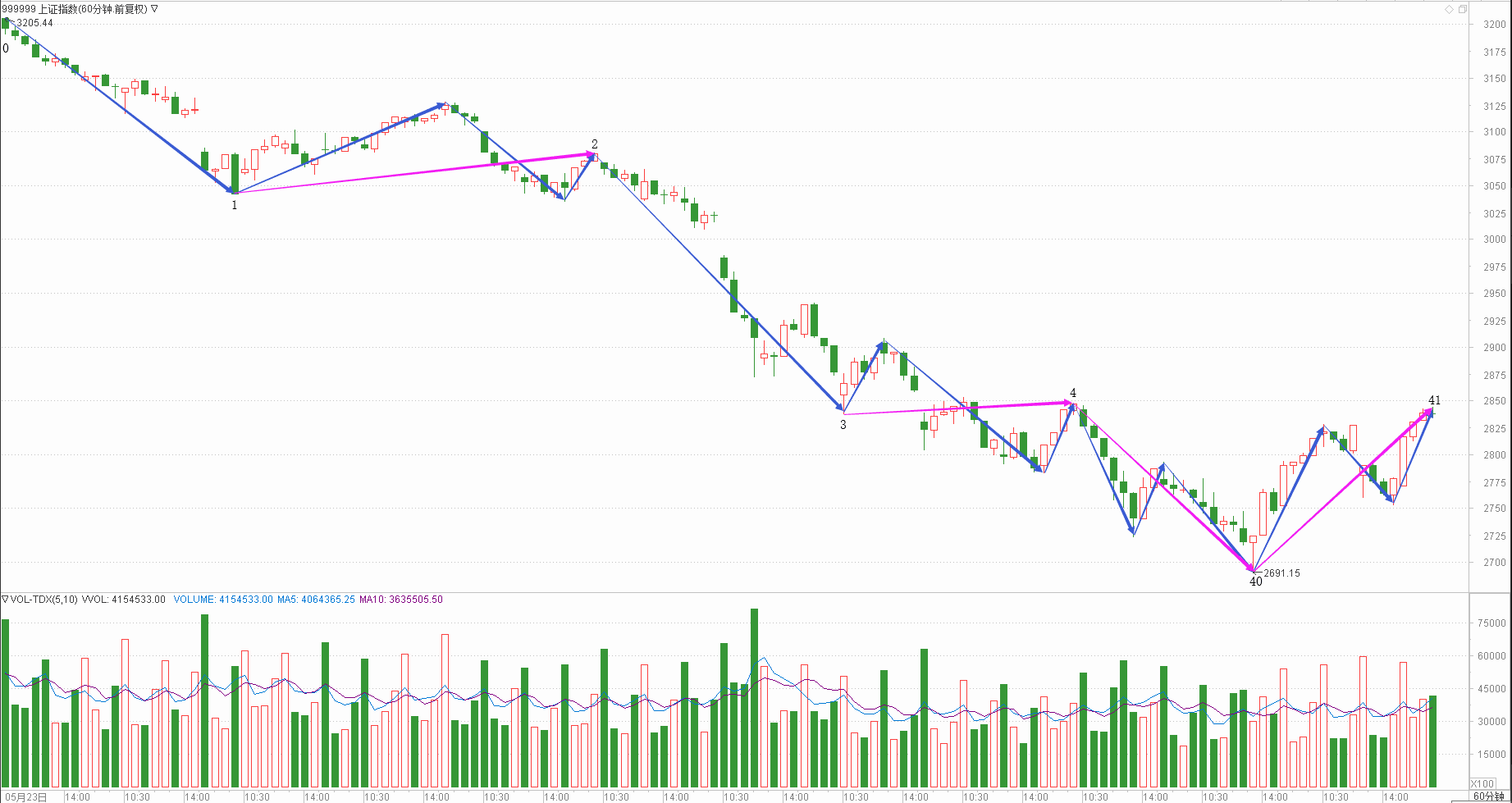 : 月线调整周线调整日线下跌时线下跌分线上涨(30+30+20+15+20)/5=23