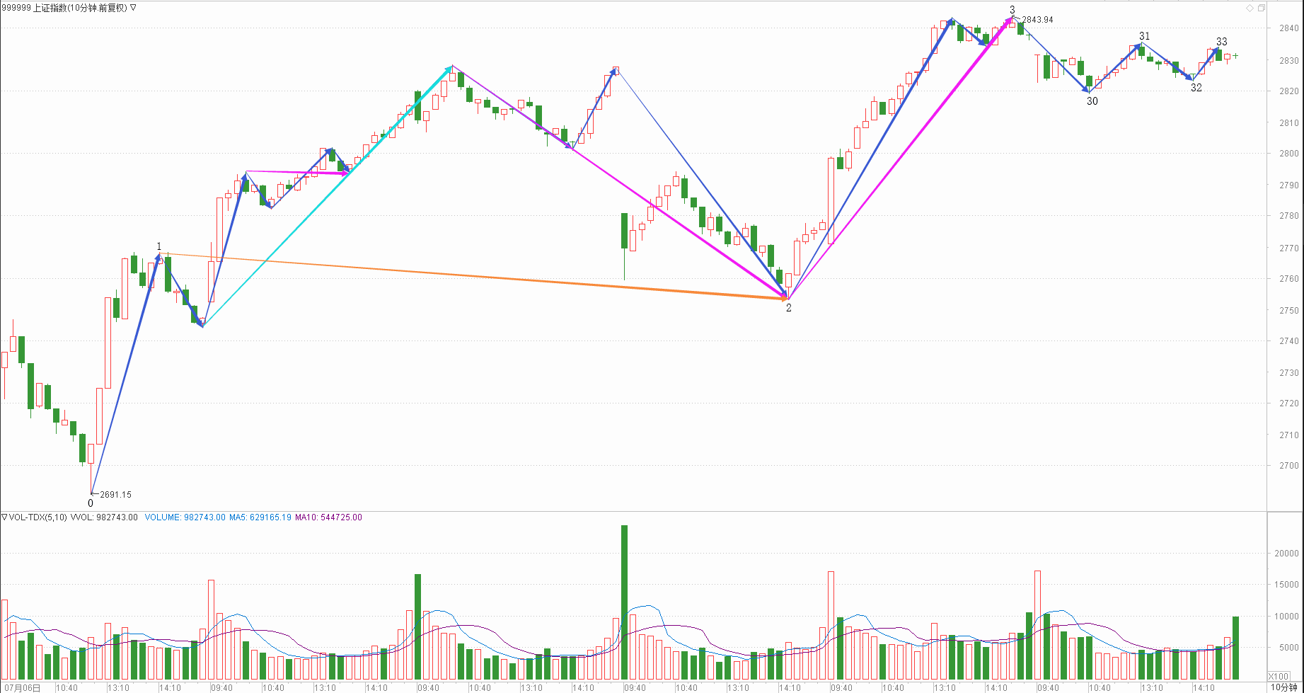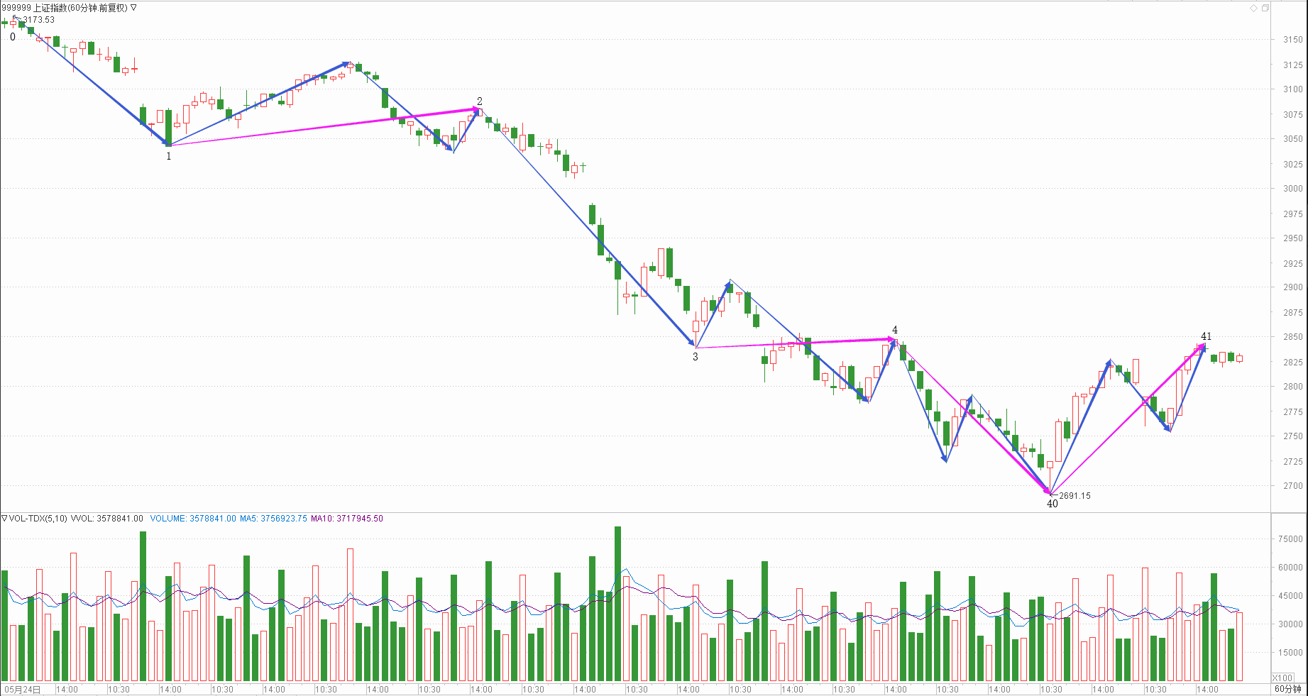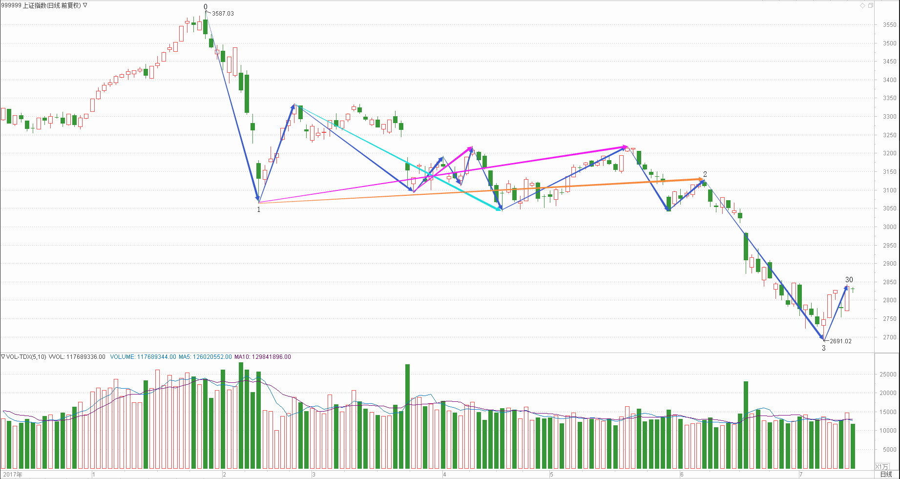 : 月线调整周线调整日线下跌时线下跌分线上涨(30+30+25+15+10)/5=22