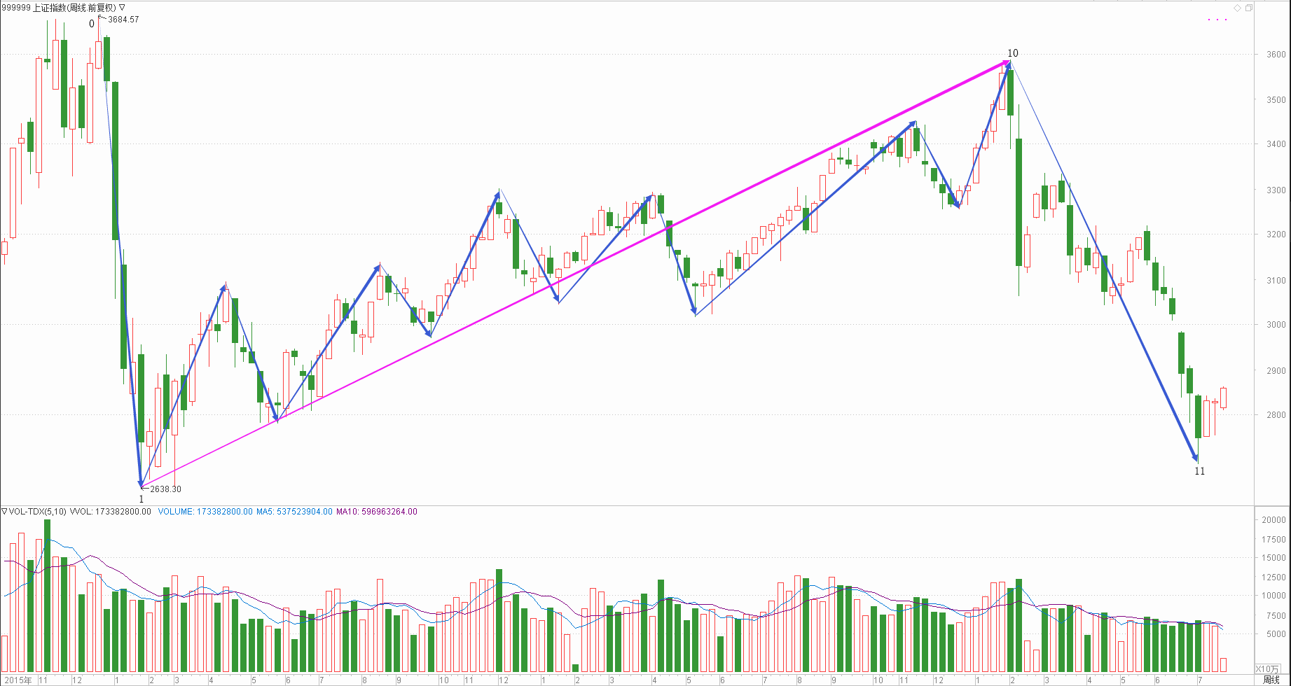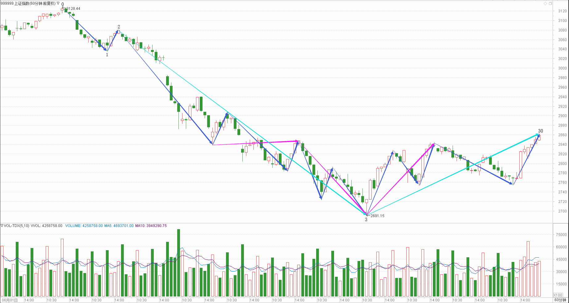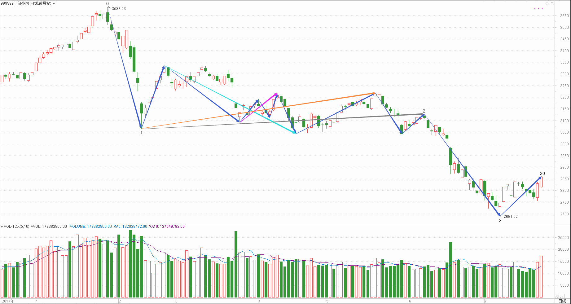 : 月线调整周线调整日线下跌时线下跌分线趋势(30+30+20+15+15)/5=22