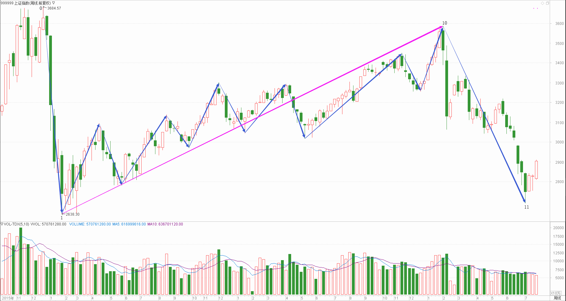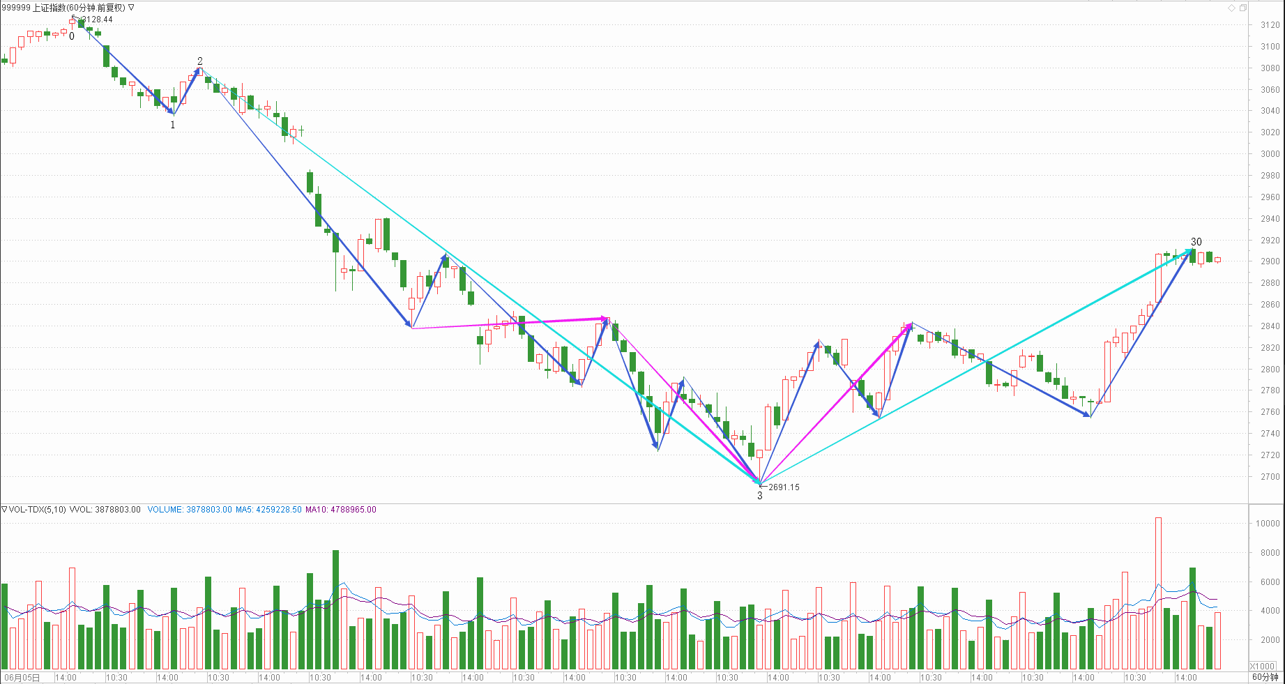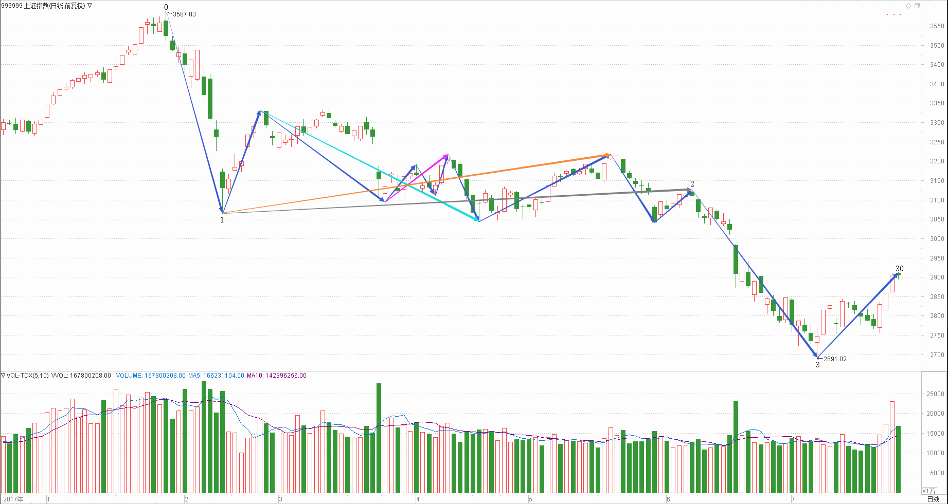 : 月线调整周线调整日线下跌时线下跌分线趋势(30+30+20+15+20)/5=23