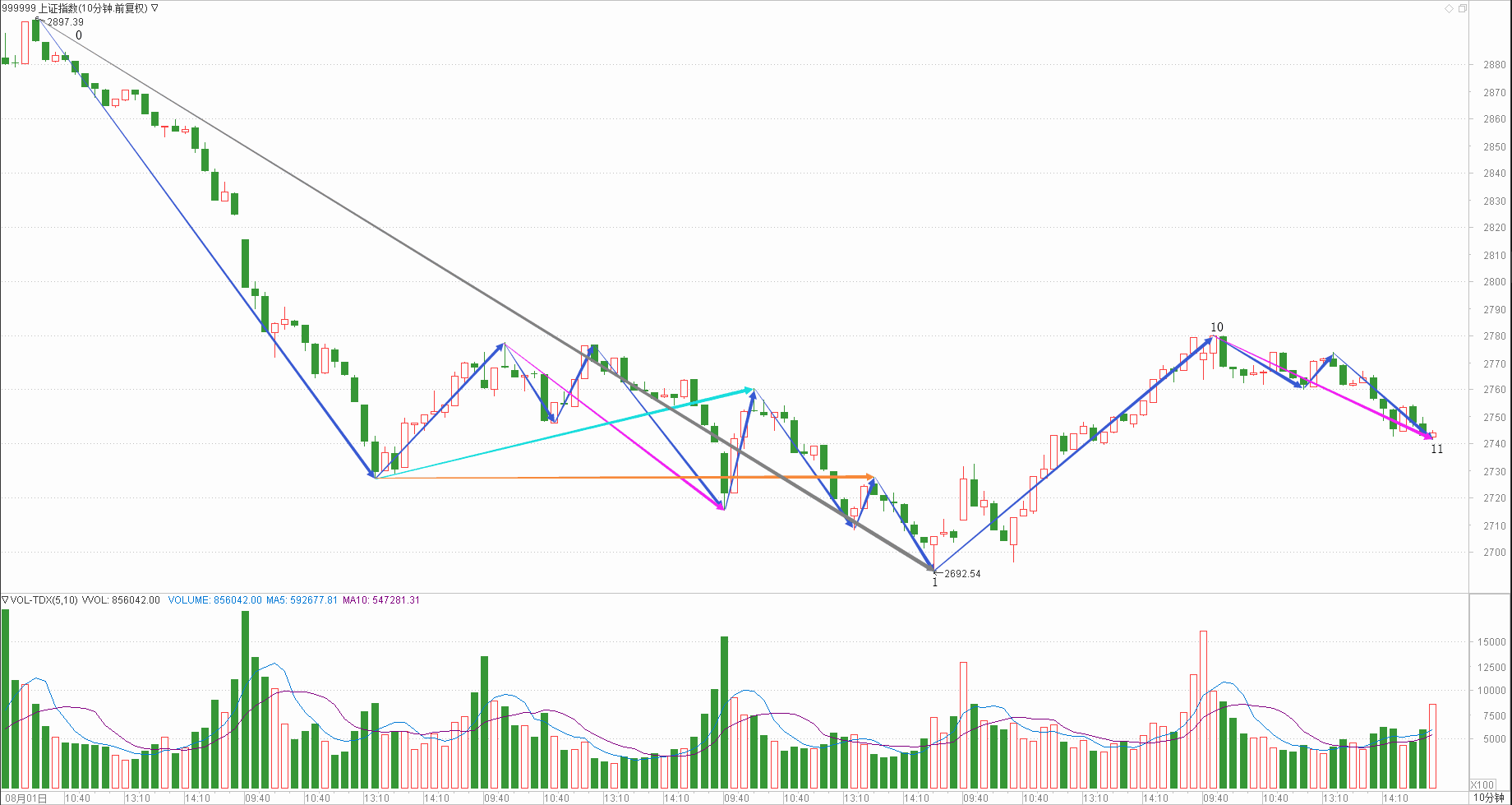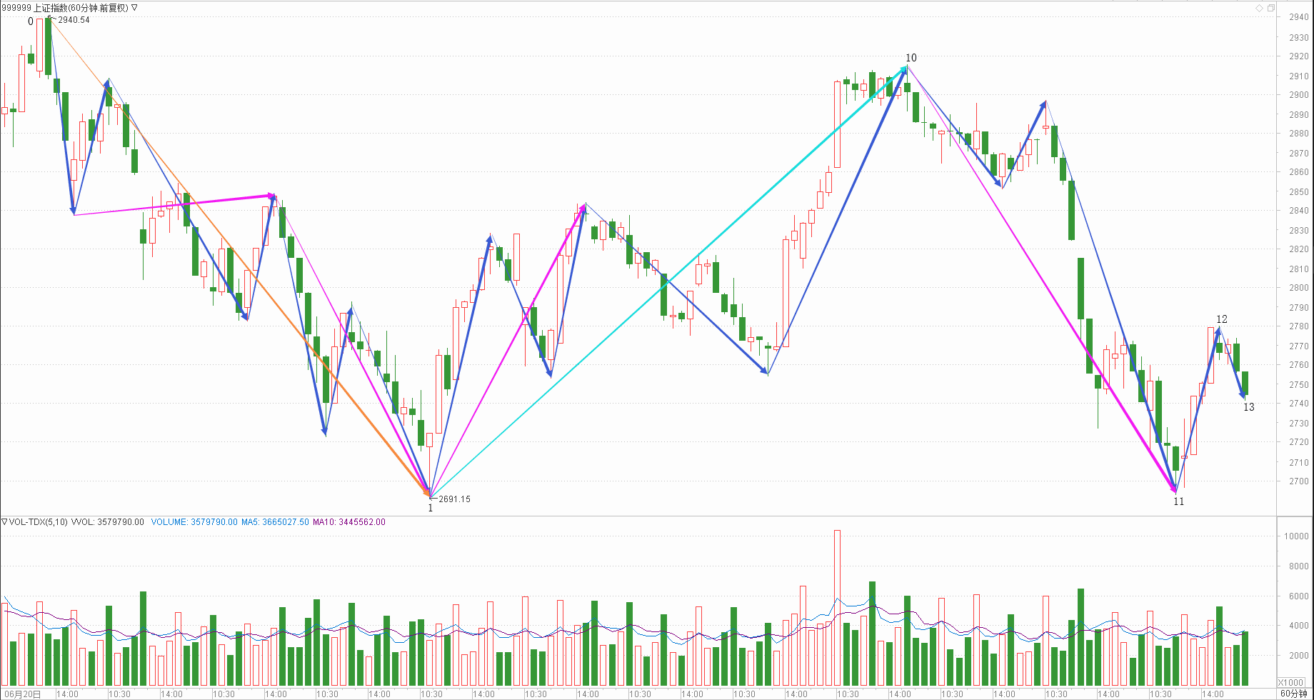 : 月线调整周线调整日线下跌时线调整分线调整(30+30+20+20+25)/5=25