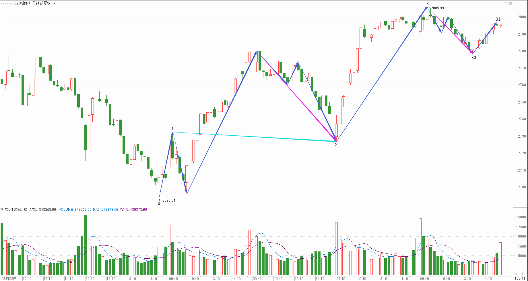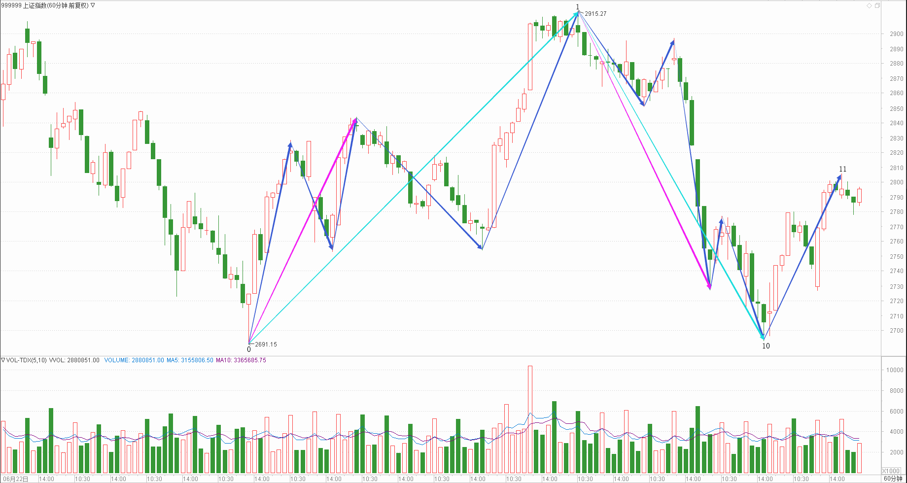 : 月线调整周线调整日线下跌时线调整分线上涨(30+30+20+20+15)/5=23