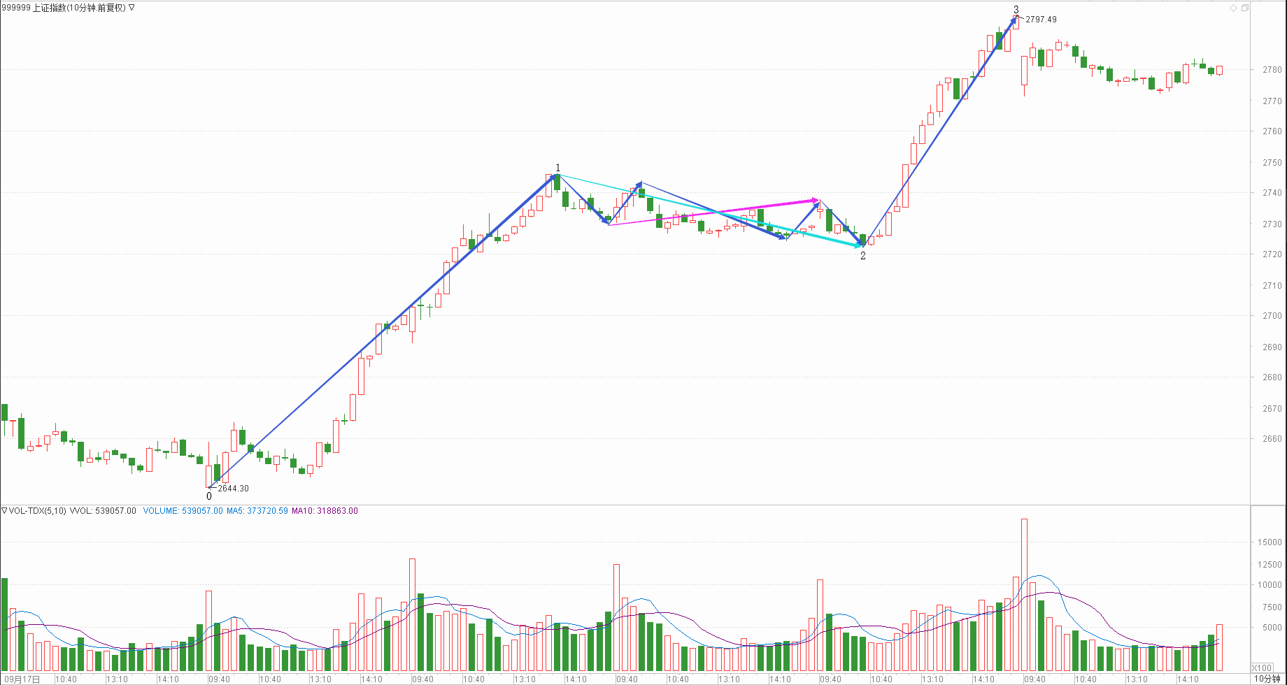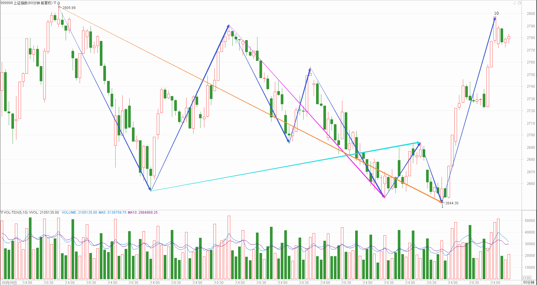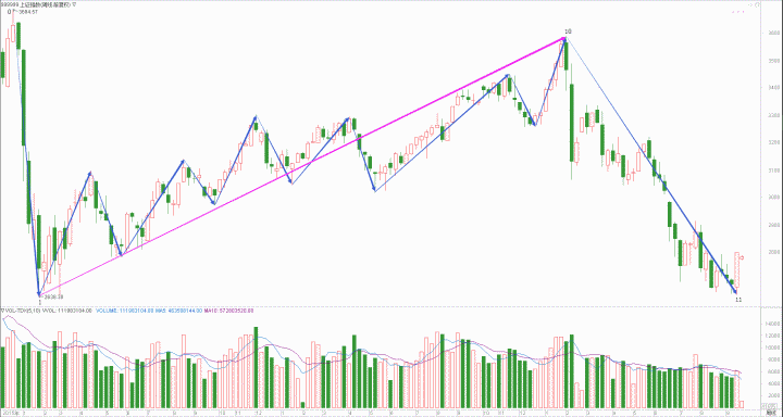 : 月线调整周线调整日线下跌时线回调分线上涨(45+40+30+25+20)/5=32