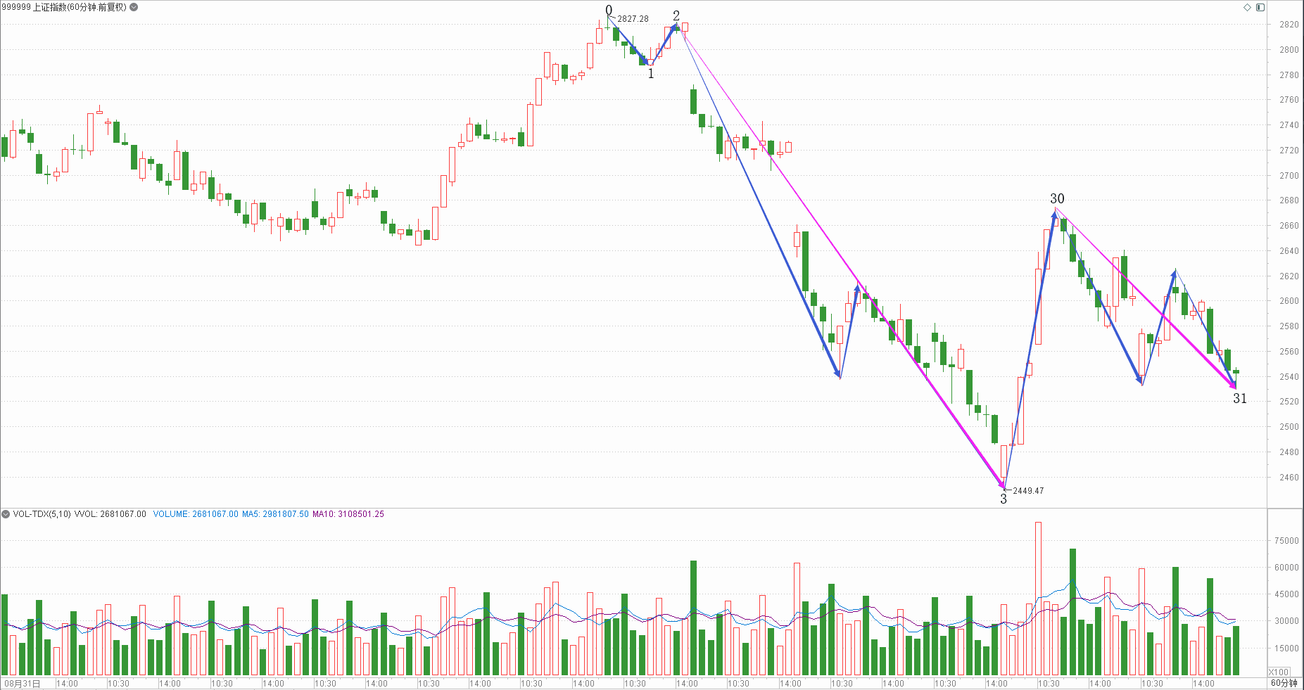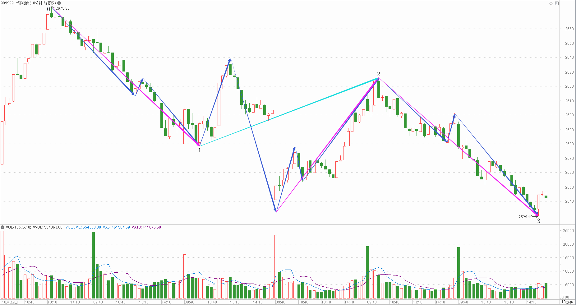 : 月线调整周线下降日线趋势时线下跌分线下跌(60+20+20+40+50)/5=38