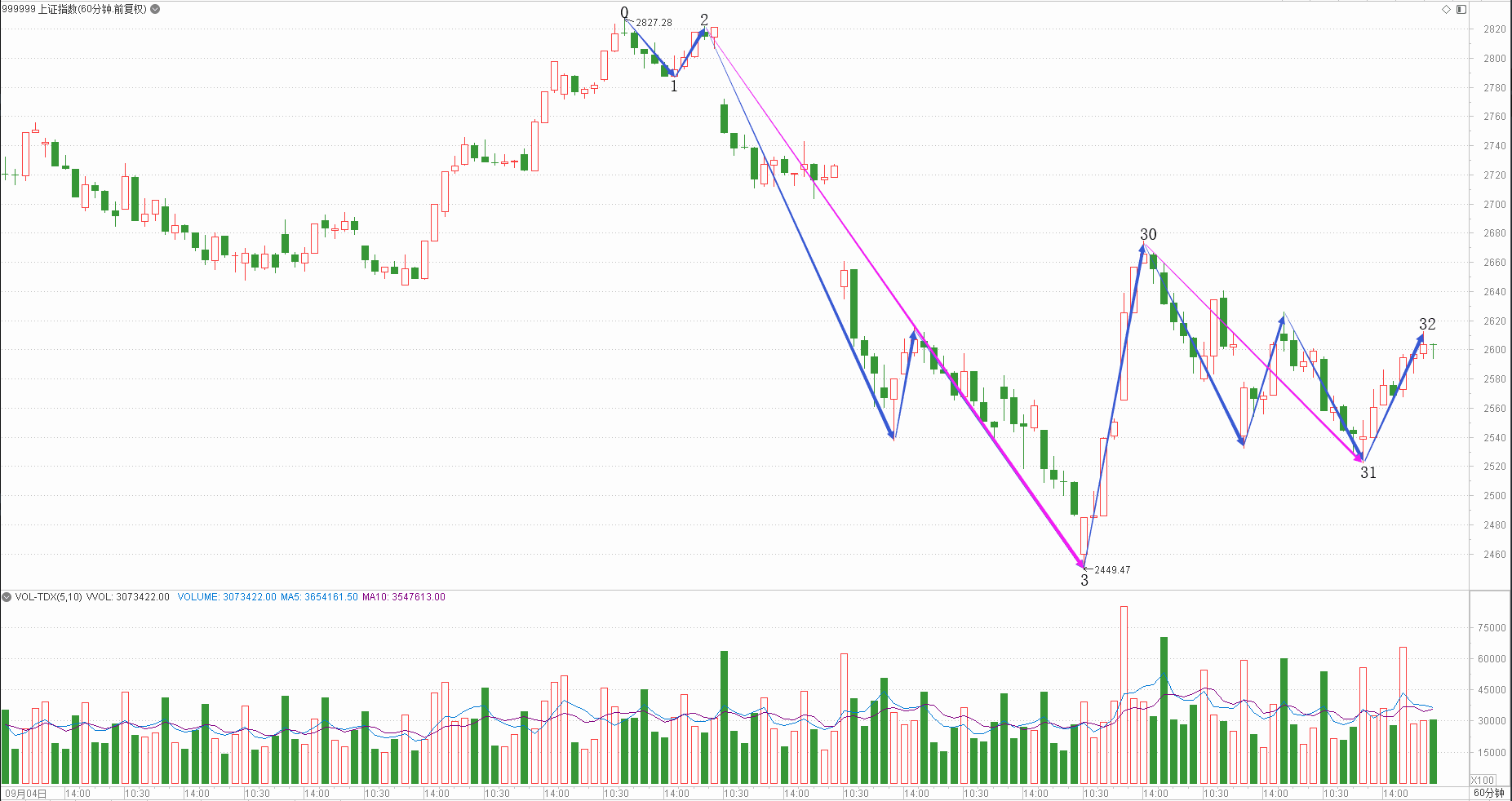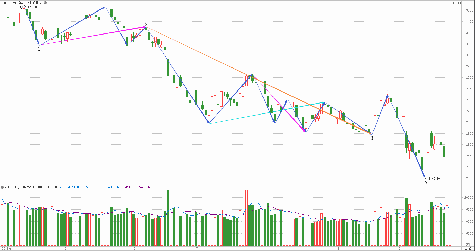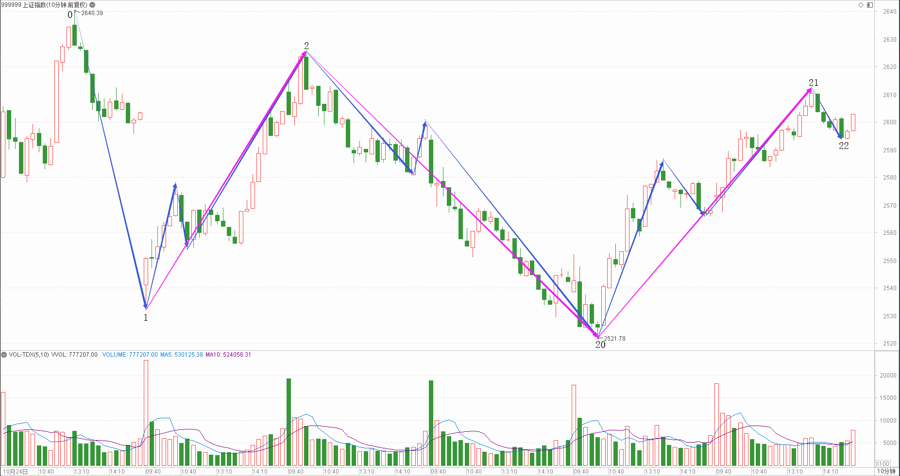 : 月线调整周线下降日线趋势时线下跌分线中继(60+20+20+10+20)/5=26